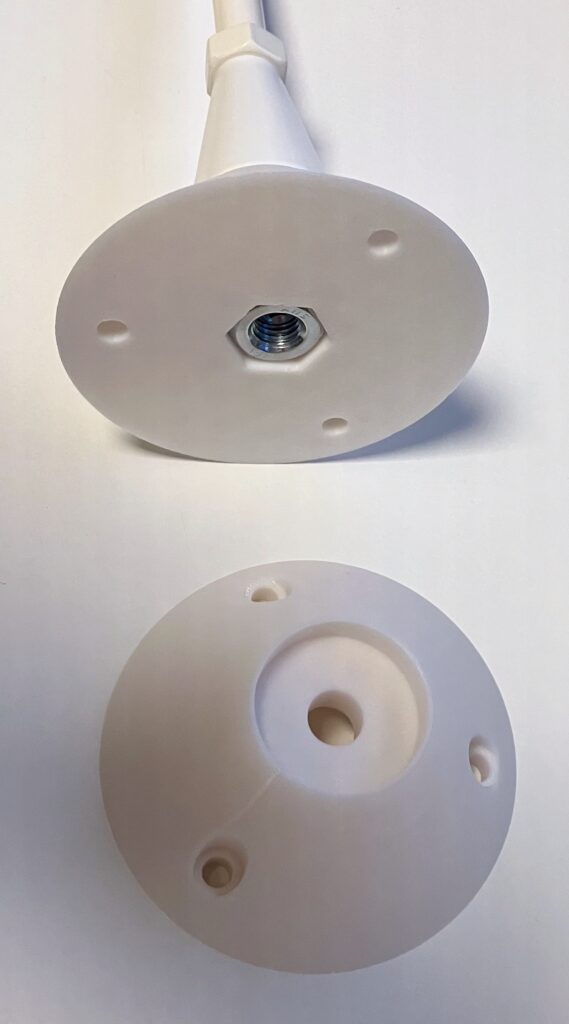 That finally screwed down, I designed (in Autodesk Fusion) a ceiling mount that this threaded end could fit into that I could 3D print. It looks much nicer than the stock mounting plate, and the screw holes are designed to take nice stainless steel Allen bolts. Because it’s designed to mount vertically and bolted to the ceiling, the plastic will be mostly in compression, a direction that’s nice and strong for printed parts, though the speakers only weigh 3kg each. I printed it with a generic white PLA Meta filament that only took 70 mins to print two of my design on my Bambu P1S and feels really strong even with only a 15% infill (though with 5 walls). You can find the model on Thingiverse and Makerworld.